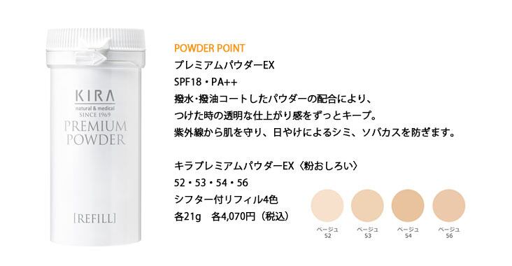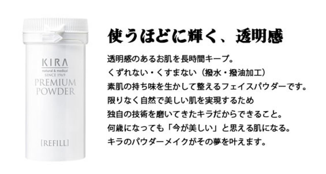 透明感のあるお肌を長時間キープ。くずれない・くすまない(撥水・撥油加工)、素肌の持ち味を生かして整えるフェイスパウダーです。限りなく自然で美しい肌を実現するため、独自の技術を磨いてきたキラだからできること。何歳になっても「今が美しい」と思える肌になる。キラのパウダーメイクがその夢を叶えます。