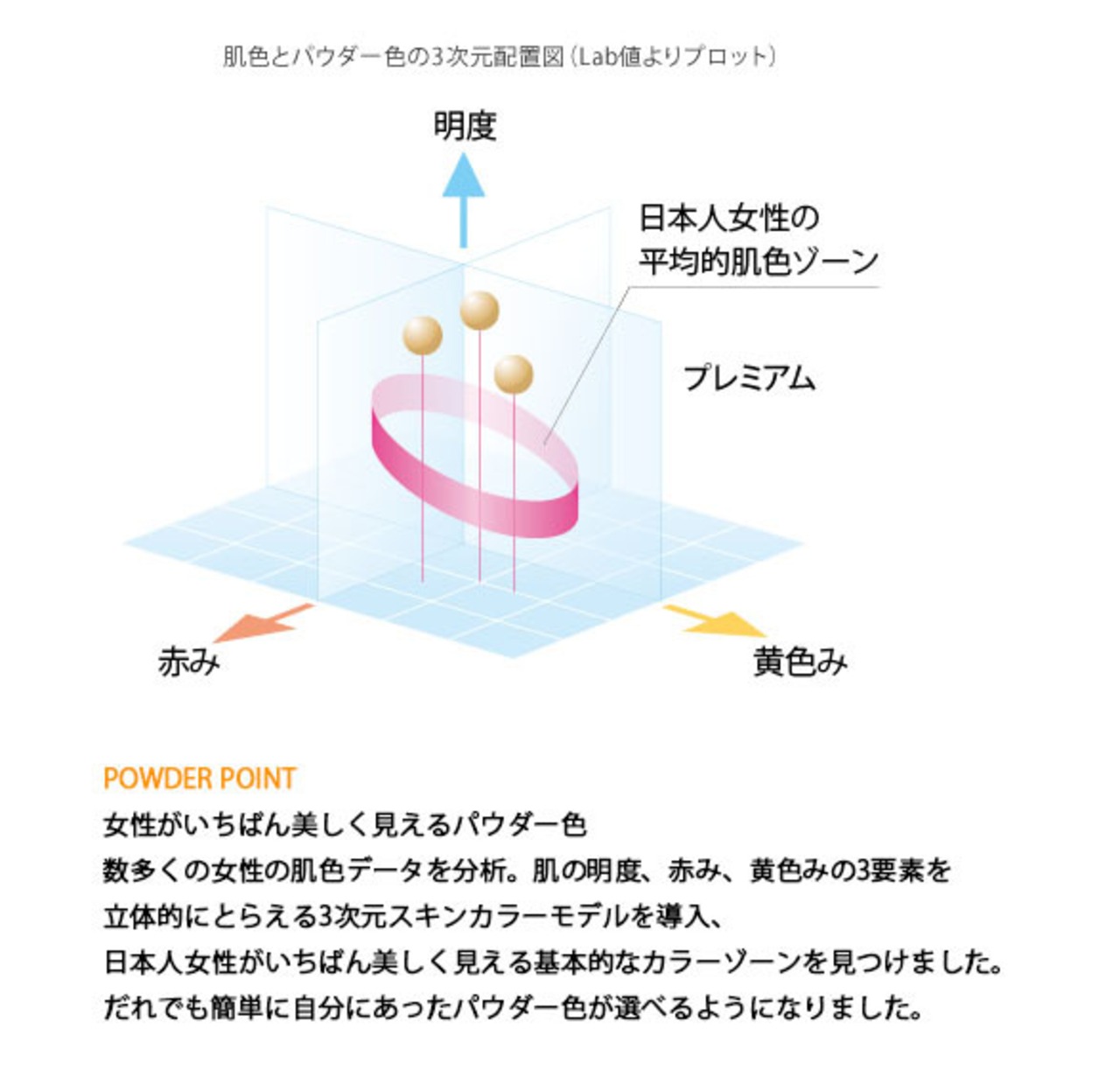数多くの女性の肌色データを分析。肌の明度、赤み、黄色みの3要素を立体的にとらえる3次元スキンカラーモデルを導入、日本人女性がいちばん美しく見える基本的なカラーゾーンを見つけました。だれでも簡単に自分にあったパウダー色が選べるようになりました。